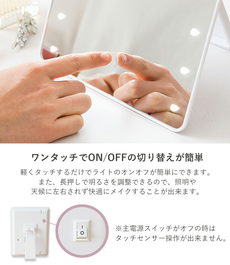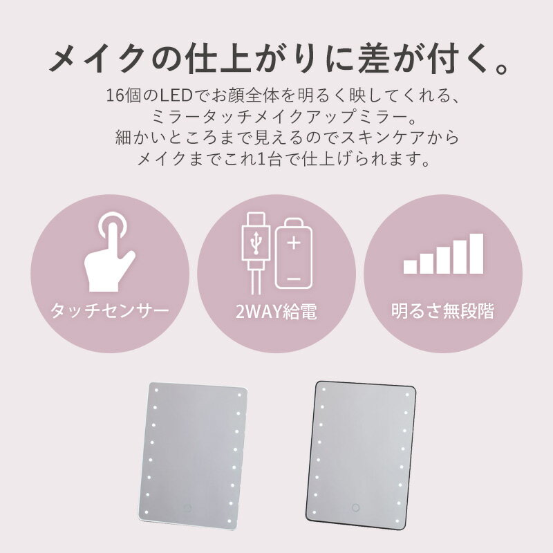 16個のLEDでお顔全体を明るく映してくれる、ミラータッチメイクアップミラー。