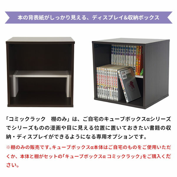 キューブボックスα専用オプション コミックラック棚のみ 【サイズ】 棚:幅31.8×高さ13.0×奥行13.5(cm) 【材質】 本体素材:パーティクルボード 【重量】 約630g 【生産国】 ベトナム 【お客様組立品】 お客様ご自身で組み立てていただきます(所用時間 約5分) 【備考】 ※キューブボックスα及びキューブボックスαハーフ専用オプションです。