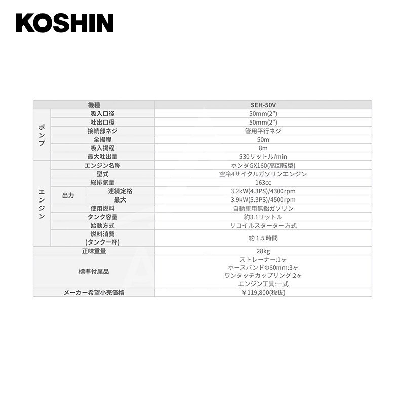 機種 SEH-50V 吸入口径 50mm(2″) 吐出口径 50mm(2″) 接続部ネジ 管用平行ネジ 全揚程 50m 吸入揚程 8m 最大吐出量 530リットル/min エンジン名称 ホンダGX160(高回転型) 型式 空冷4サイクルガソリンエンジン 総排気量 163cc 出力 連続定格 3.2kW(4.3PS)/4300rpm 最大 3.9kW(5.3PS)/4500rpm 使用燃料 自動車用無鉛ガソリン タンク容量 約3.1リットル 始動方式 リコイルスターター方式 燃料消費(タンク一杯) 約 1.5 時間 正味重量 28kg 標準付属品 ストレーナー:1ヶ ホースバンドΦ60mm:3ヶ ワンタッチカップリング:2ヶ エンジン工具:一式 ※季節商品のため、在庫切れ及びお届けまでお時間いただく場合がございます。
