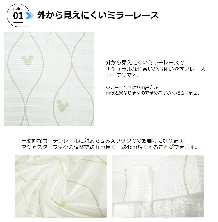■商品名:ミラーレース 三つ丸ミッキー 2枚組■サイズ:幅100×丈176cm (2枚組)■組成:ポリエステル100%■洗濯可(ネット使用) 1.5倍ヒダ、タッセルなし、Aフック■中国製三つ丸ミッキー(遮光カーテン)サイズ一覧100×135cm 100×178cm 100×200cm三つ丸ミッキー(レースカーテン)サイズ一覧100×133cm 100×176cm 100×198cm▼ご注意※商品の出荷はメーカーより直送のため代金引換はご利用できませんのでご了承くださいませ。